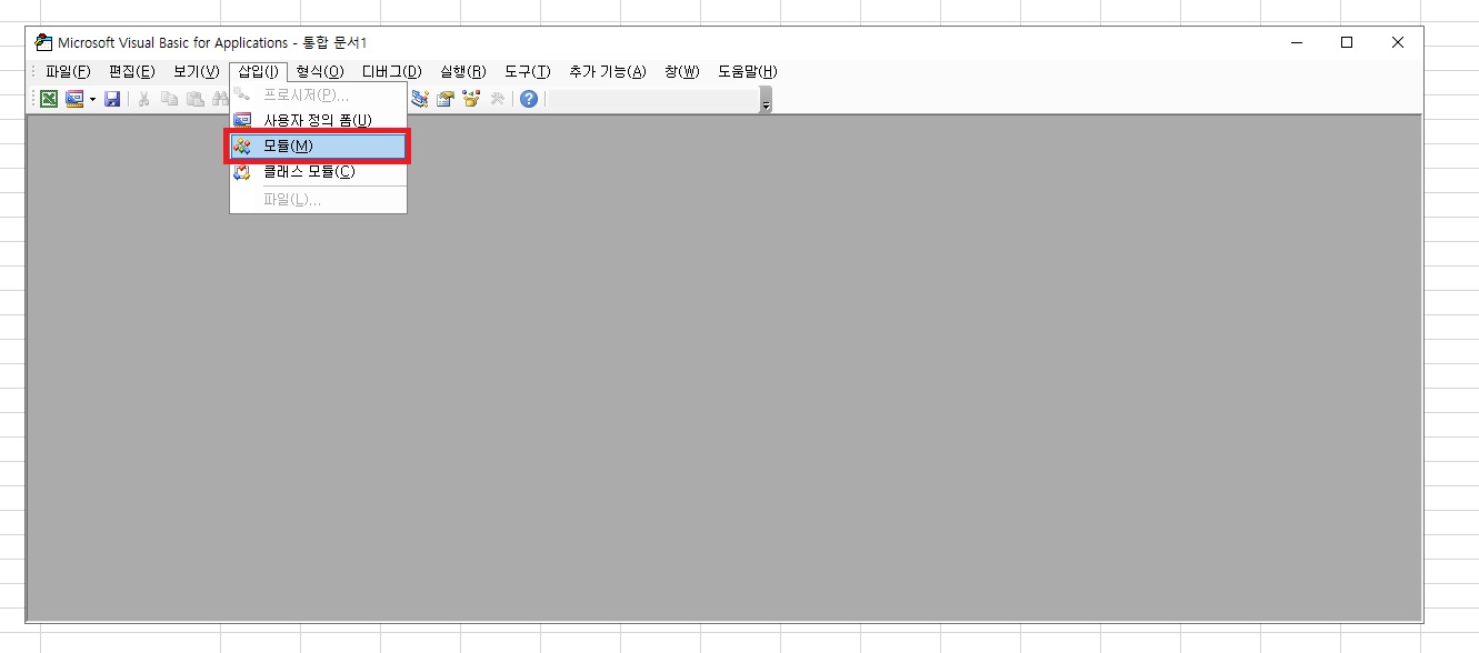 Visual Basic을 켜면 아래와 같은 창이 나타나고, 여기에서 삽입>모듈을 클릭한다.