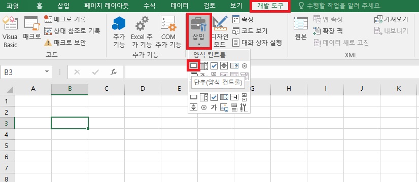 엑셀 파일에서 개발도구>삽입>단추(양식컨트롤)을 클릭한다.