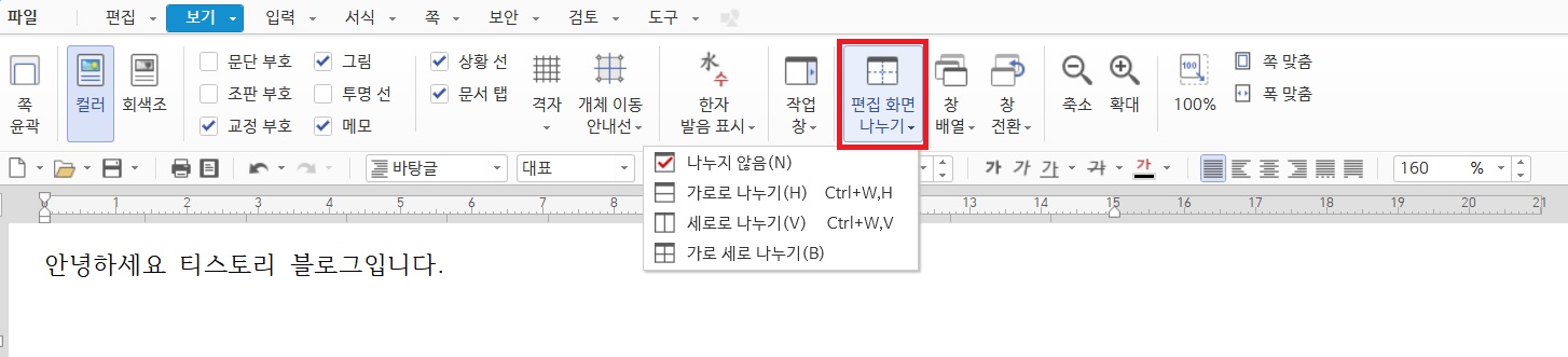 아래아 한글 편집화면 나누기/아래아 한글 한 파일의 서로 다른 부분 보기