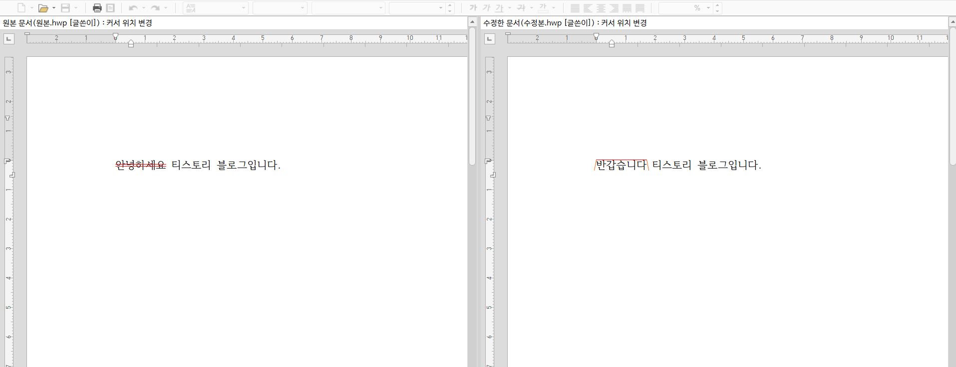 여기에서 비교를 클릭하면 아래와 같이 비교된 두개의 문서가 나타나며, 수정된 내용이 표시되기 때문에 문서를 비교할 수 있다.