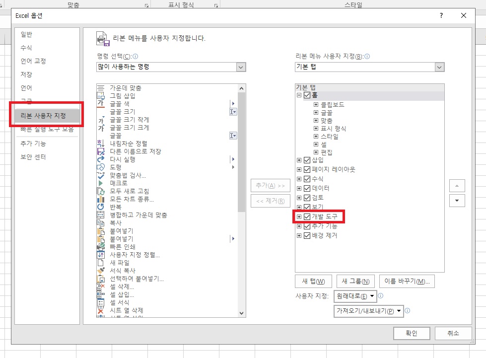 여기서 아래 캡쳐와 같이 리본 사용자 지정을 클릭하고, 표시된 개발도구의 체크를 설정한 뒤 확인을 누르면 된다.