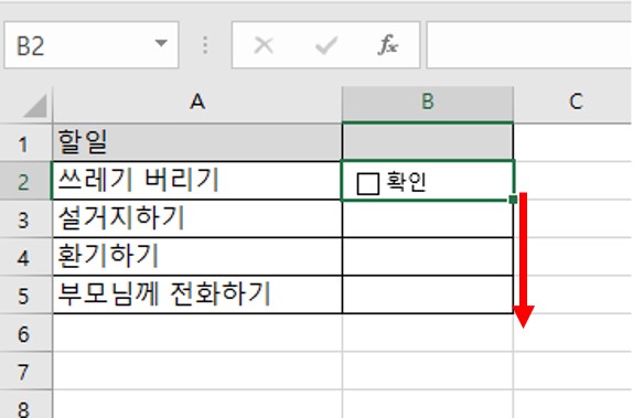 체크박스를 여러개 만들고자 하는 경우, 일일이 체크박스 아이콘을 클릭하지 않고, 체크박스가 들어있는 셀을 아래로 드래그 하면 아래 그림과 같이 여러개의 체크박스가 만들어진다.