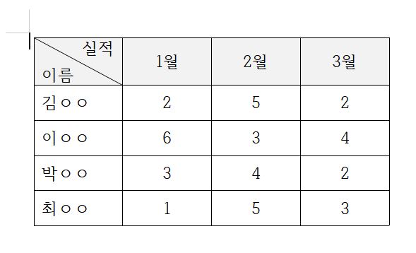 아래아 한글의 표 작업 중, 아래와 같은 경우에 하나의 칸에 대각선을 넣어야 할 필요성이 생긴다.