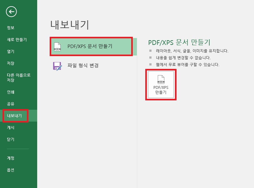 아래 그림과 같이 [파일]에서 [내보내기>PDF/XPS 문서 만들기]를 클릭하면 엑셀 내용을 PDF로 출력할 수 있다.