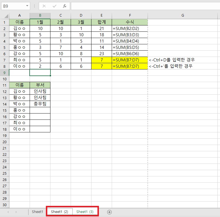 아래와 같이 Shift 또는 Ctrl을 누른 뒤 출력하고자 하는 시트를 클릭하여, 복수의 시트를 선택한다.