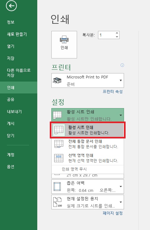 이후, 아래와 같이 활성 시트 인쇄를 클릭하면, 선택된 시트가 모두 출력된다.